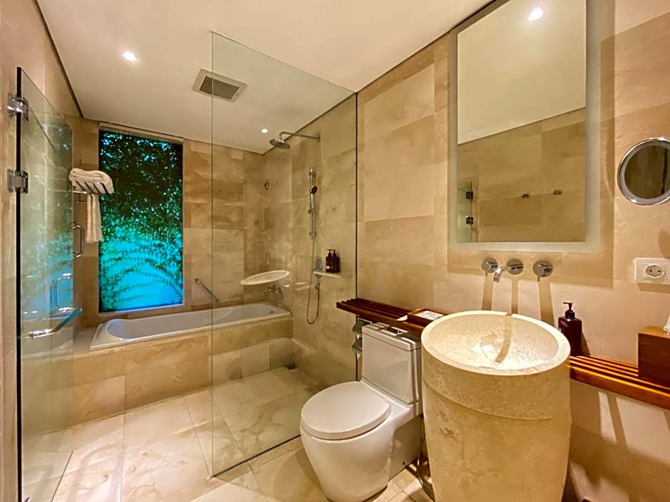 Single level Bungalows with Balinese architecture style & design. All ground level Deluxe Garden Bungalows have a terrace facing the garden.